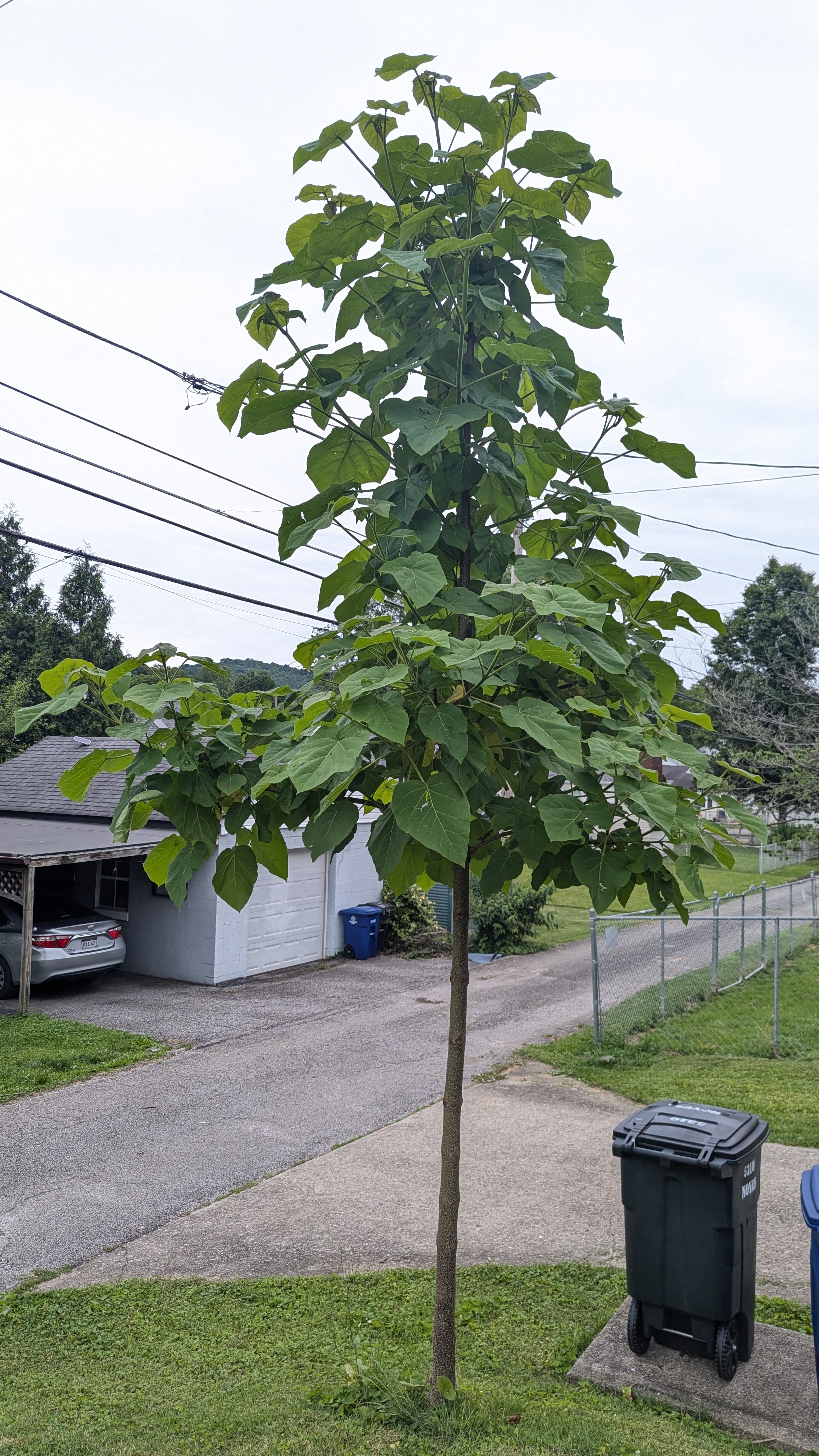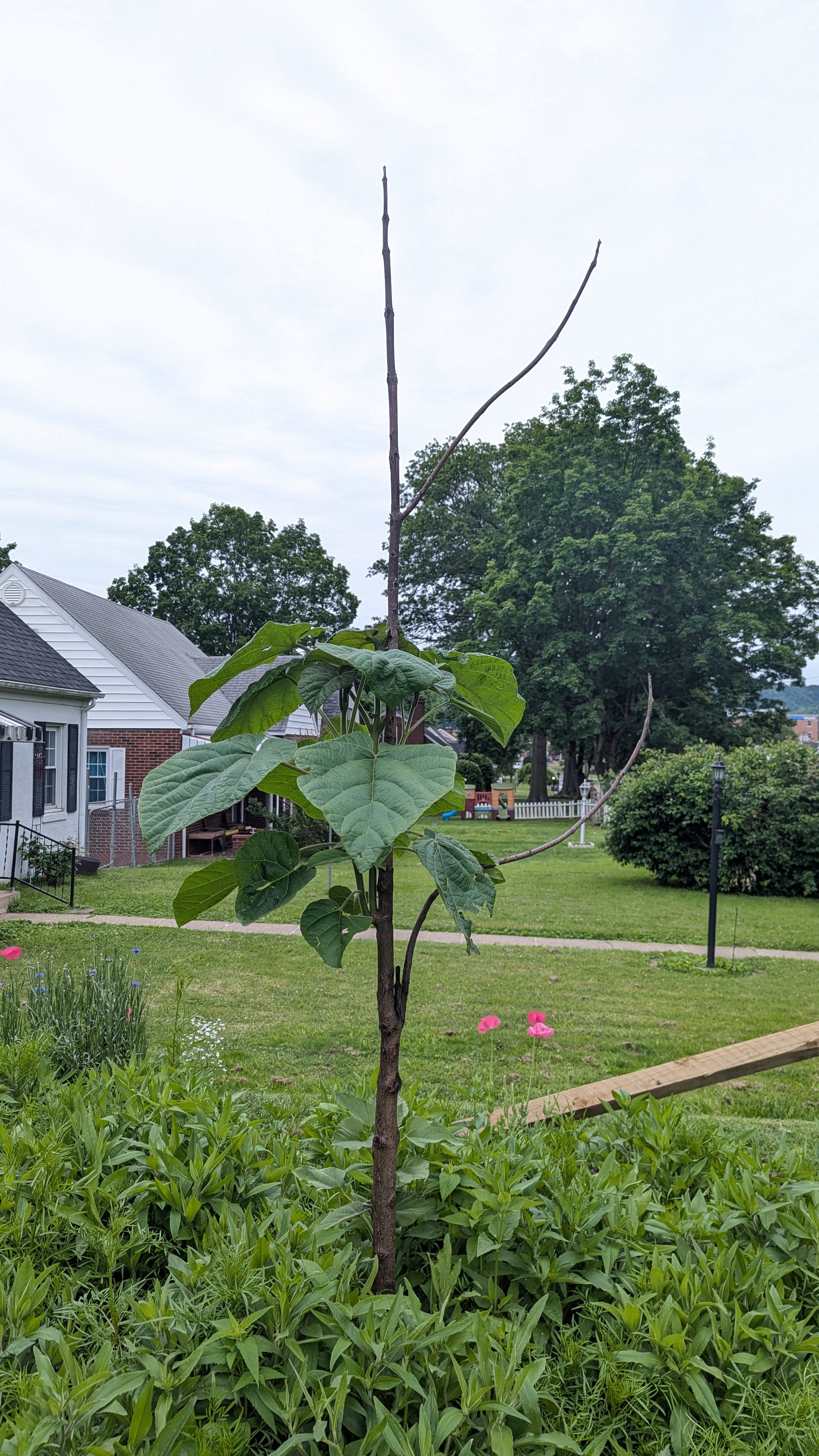 The Princess Tree (Paulownia tomentosa) has had a tremendously productive spring. I decided to prune the root clones it sent up las year in hopes that more energy would be diverted to the canopy of the main trunk, and it seems to have paid off. I also kept the main trunk free of suckers, and didn’t allow it to develop any new growth below last year’s lowest branches. The result so far (and it’s early season) is about an additional 4 feet of vertical growth and significant thickening of the canopy. Here’s a photo as of today:
